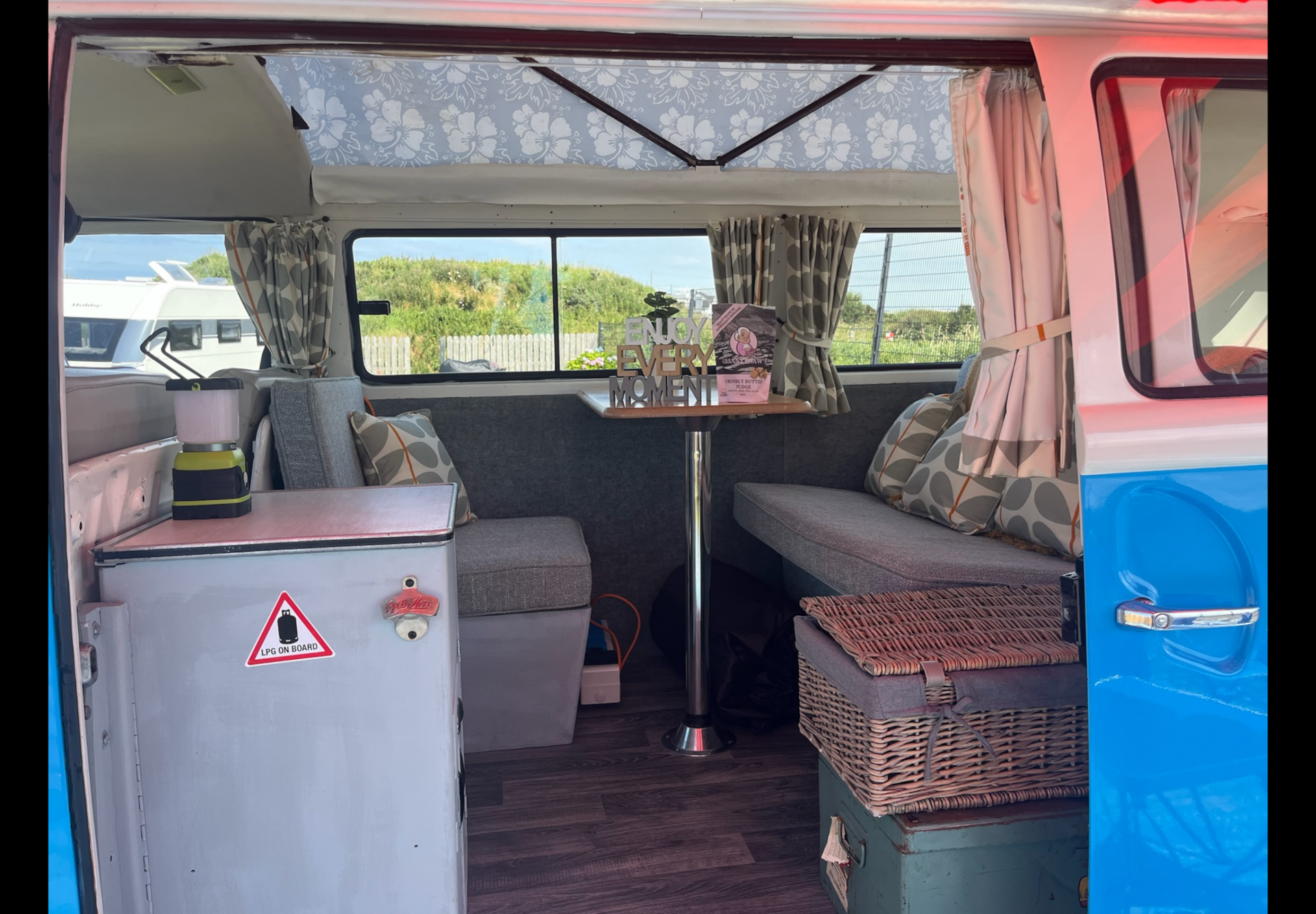By day, it’s a stylish sofa – the perfect spot to relax with a cuppa, take in the view, or plan your next adventure. Upholstered in soft-touch fabric, the cushions feature calming, neutral tones that complement the van’s vintage charm.